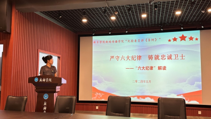 为推动党纪学习教育进一步走深走实,结合《太阳tyc151cc“纪检委员讲<条例>”活动实施方案》要求,5月28日,太阳集团tyc151cc党委在A12教学楼五楼审片室开展党纪学习教育系列专题学习活动。党委副书记贾菁以《严守六大纪律,铸就忠诚卫士》为题,为全体师生党员讲授专题党课。