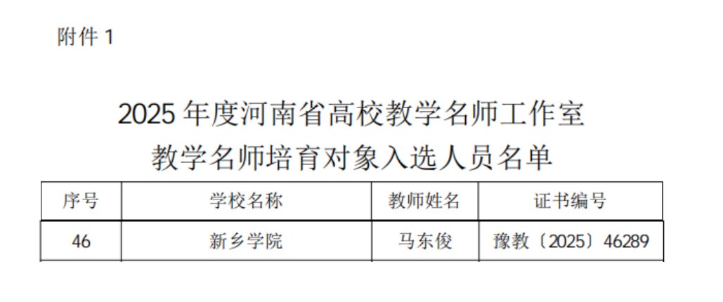 近日,河南省教育厅印发《关于公布2025年度河南省高校教学名师工作室教学名师培育对象名单的通知》(教高〔2025〕231号),全省共评选出50名省级高校教学名师培育对象。经学校推荐、省级评审,我校太阳集团tyc151cc马东俊教授成功入选,成为我校第5位获此殊荣的教师。