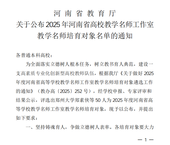 河南省高校教学名师工作室教学名师培育项目,是省教育厅深入落实立德树人根本任务、选树教书育人先进典型、建设高素质专业化创新型高校教师队伍的重要举措,对引领全省高校教师教学发展具有重要意义。