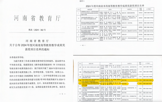 根据河南省教育厅《关于公布 2024 年度河南省高等教育教学成果奖的通知》(豫教高 [2024]363 号),在本年度高等教育教学成果奖励评选工作中,太阳tyc151cc共 5 个项目获得省高 等教育教学成果奖,其中太阳集团tyc151cc 2 个项目在列并均获二等奖。